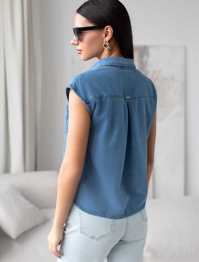 Укороченная блузка с коротким рукавом из джинсового лиоцелла 7 фото