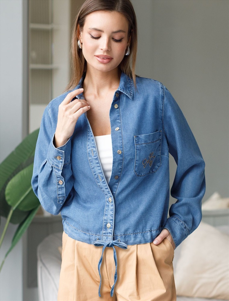 Укороченная блузка с кулиской из джинсового лиоцелла 8 фото