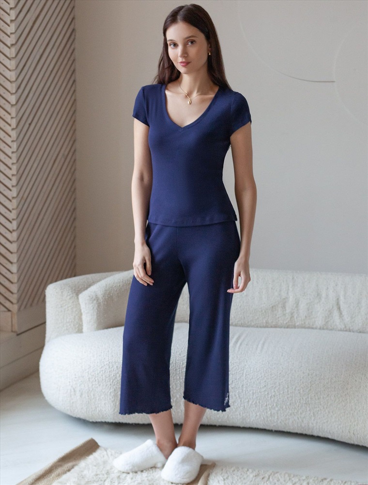 Укороченные брюки с поясом на резинке из фактурного трикотажа в рубчик с вышивкой 7 фото