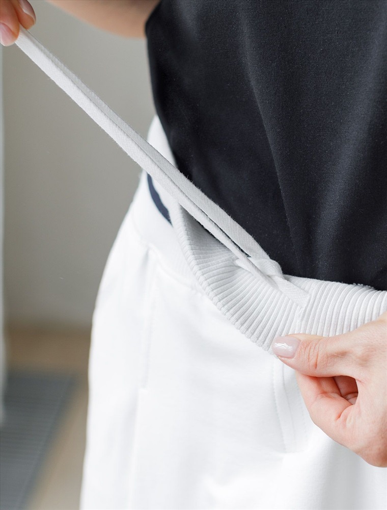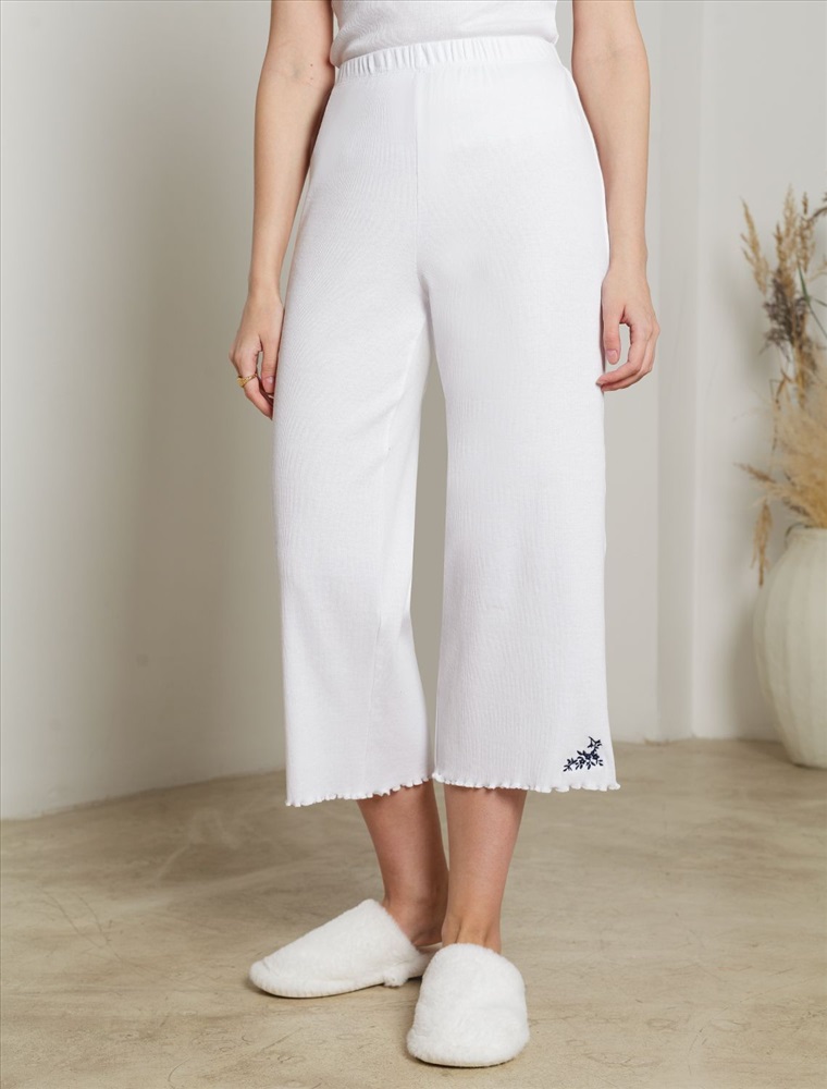 Укороченные брюки с поясом на резинке из фактурного трикотажа в рубчик с вышивкой 5 фото
