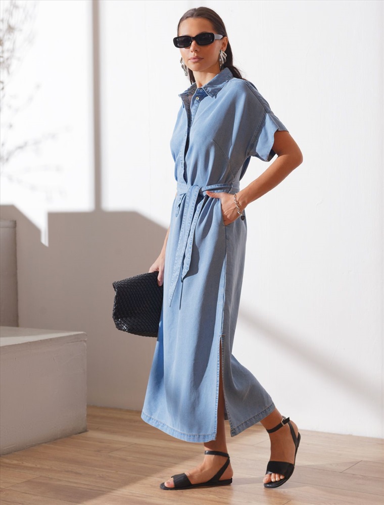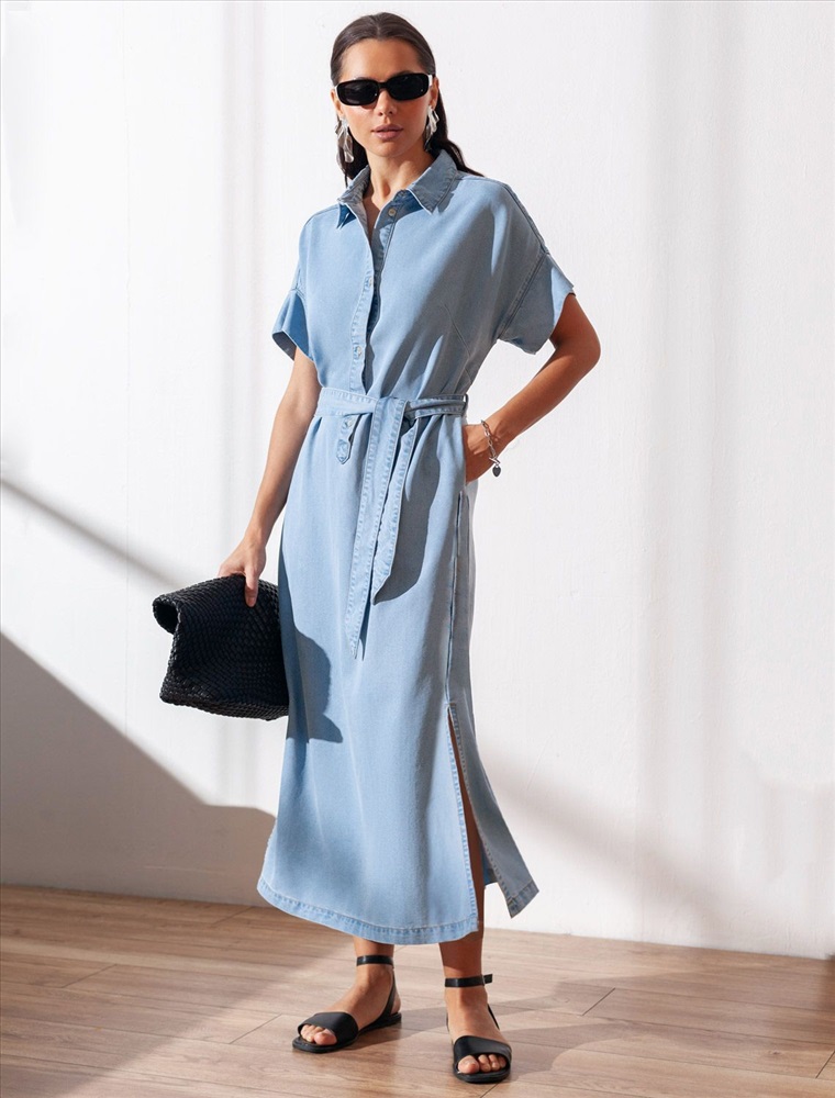 Длинное платье-рубашка с поясом и разрезами из джинсового лиоцелла 5 фото