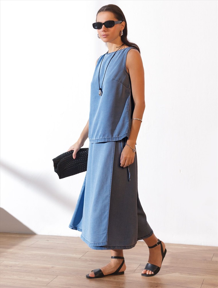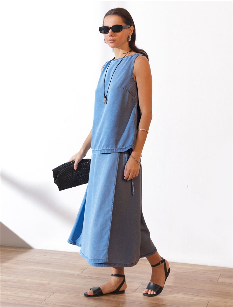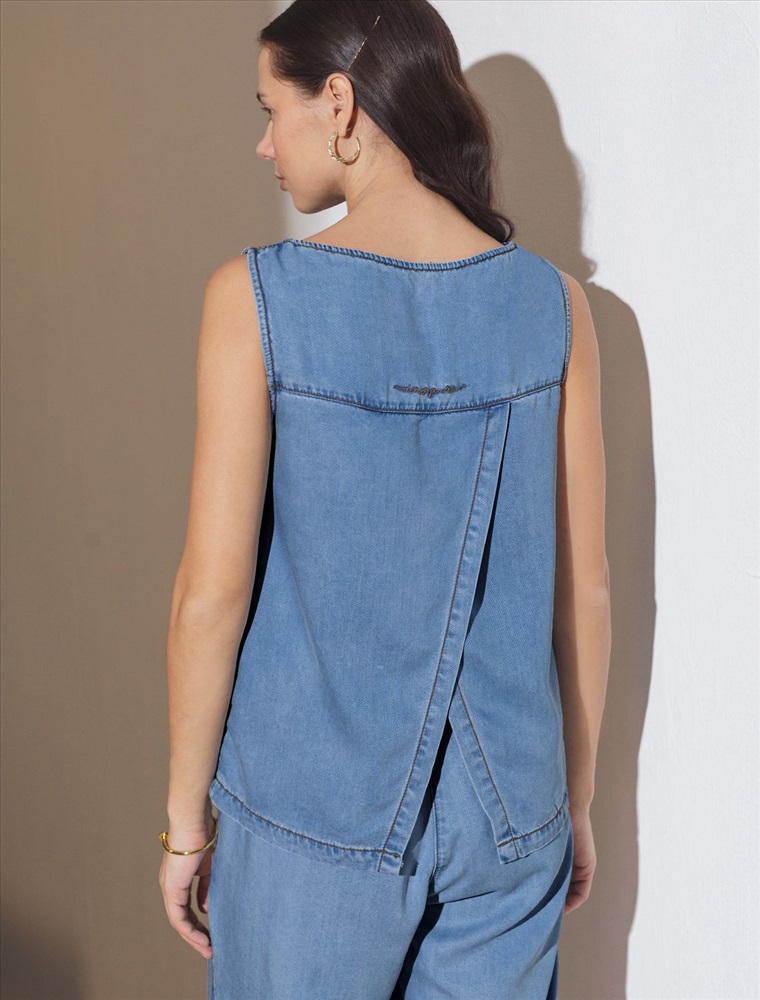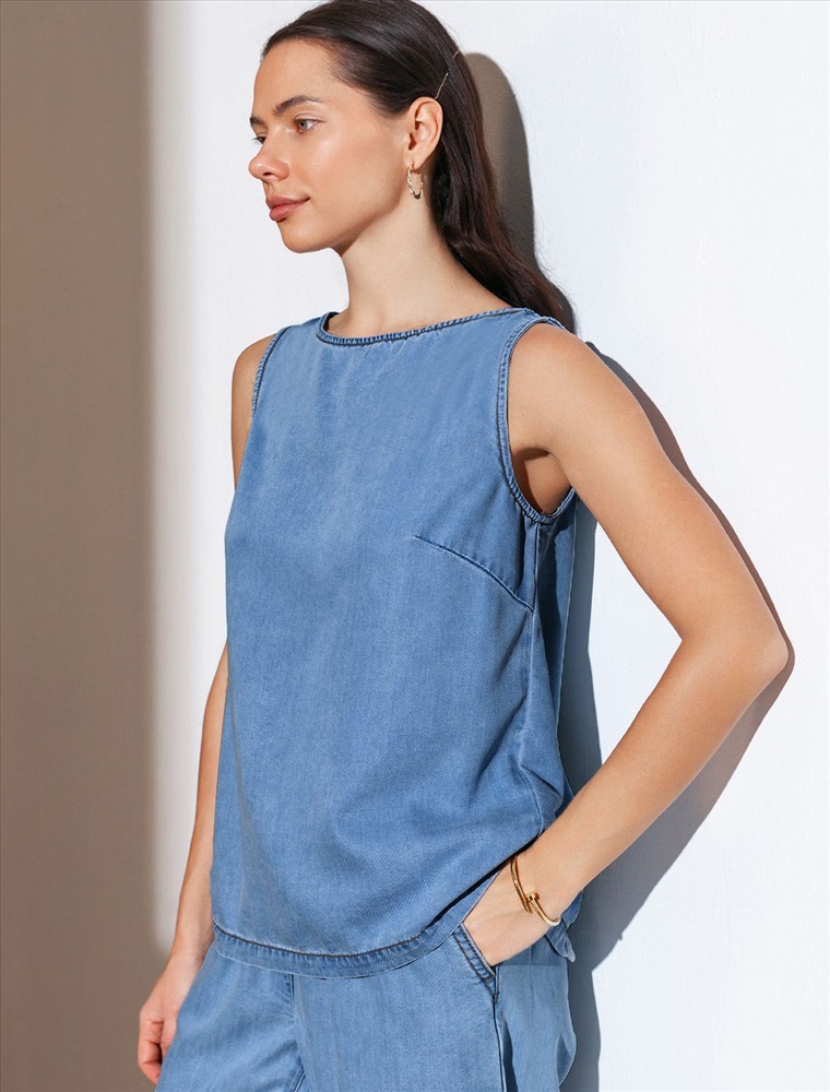 Топ с вырезом лодочка и асимметричным разрезом на спине из джинсового лиоцелла 5 фото